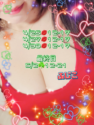 今日もいます♡12-17(。・・)ノぉはょぅ♪昨日はご来店ありがとうございますご指名、ご延長ありがとう«٩(*´ ꒳ `*)۶»もう会えなくなるから寂しいから(。・_・`。)思い出作りって二日連続で来てくれるおにーさまが何人か居てくれてとってもとっても愛感じてます(⑉• •⑉)❤︎今回辞めるのには色んな理由が重なったのもありますがお店が嫌になったからとか違うお店に行こうとしてるとかそんなんじゃないよー😊心配などもたくさんして頂けて感謝しております(*^^*)ふじこがいないならお店もう行かないとおっしゃってるおにーさまもいてそれはとても申し訳ないので新たな推し活してみてくださいね❀.(*´▽`*)❀.ふじこが退店するまでは推しのまんまで居てくれたらとっても嬉しいなー♥♥♥ってワガママ言っときますねお休みのおにーさま仕事の合間におサボりできるおにーさま貴重な時間をふじこに奪わせて💋💕 ☘️♡ ✽.。.:・゚ ✽☘️♡ ✽.。.:・゚ ✽☘️ ふじこ退店日まで あと 4 日 よろしくお願いします (⋆ᴗ͈ˬᴗ͈)” 4/25💋12-17 4/27💋12-17 4/30💋12-17 5/2 ☘️12-21☆最終日 ✧*。٩(ˊωˋ*)و✧*。 2日土曜日 21時まで頑張っちゃいます(*´³`*)